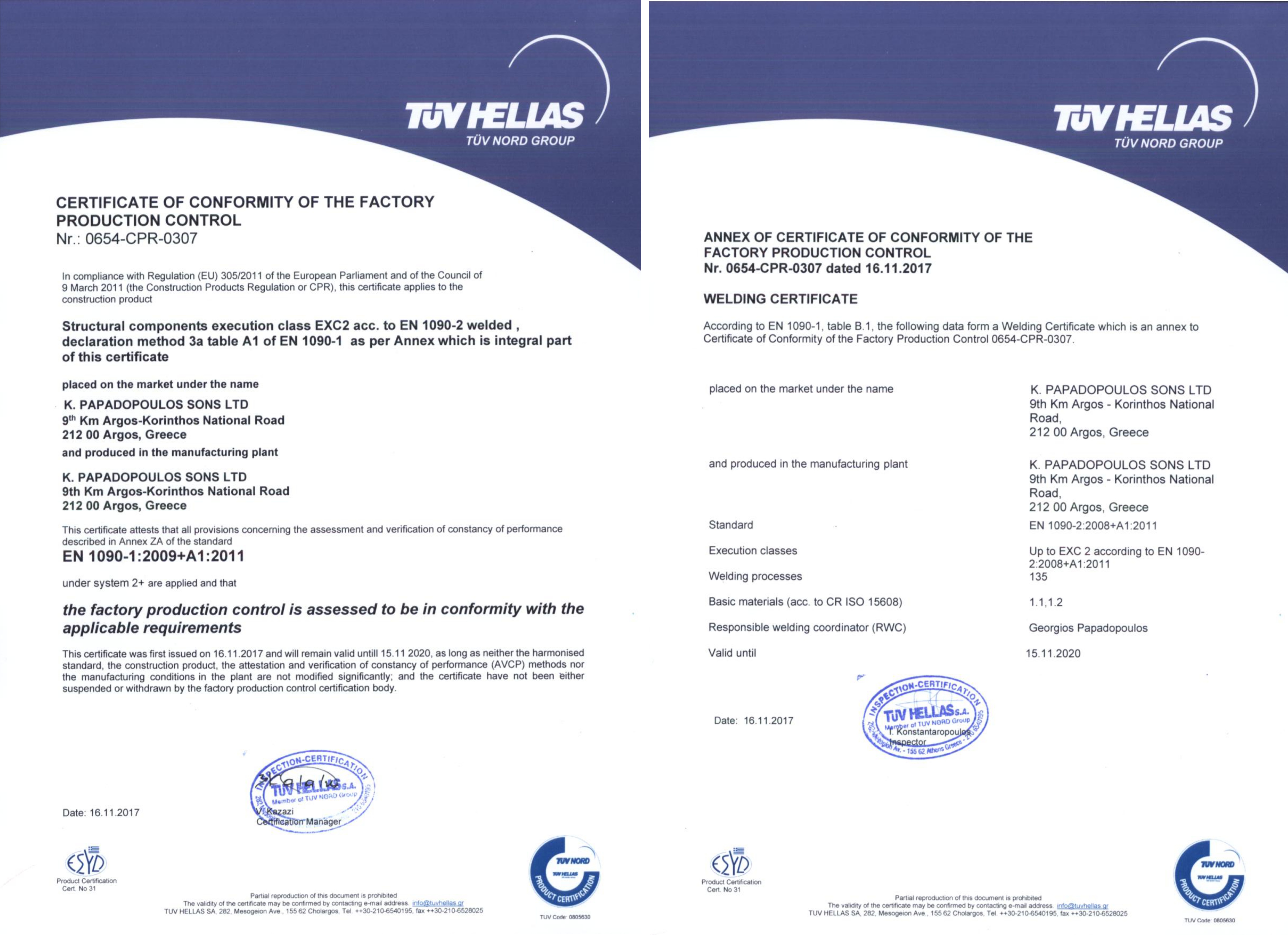 Λαμβάνοντας υπόψη τα ανωτέρω η εταιρεία ΜΕΤΑΛΛΙΚΑ ΚΤΙΡΙΑ ΠΑΠΑΔΟΠΟΥΛΟΣ Ο.Ε. κίνησε άμεσα τις απαιτούμενες για την πιστοποίησή της διαδικασιες βάσει ISO 1090 με αποτέλεσμα στην παρούσα φάση να κατέχει: