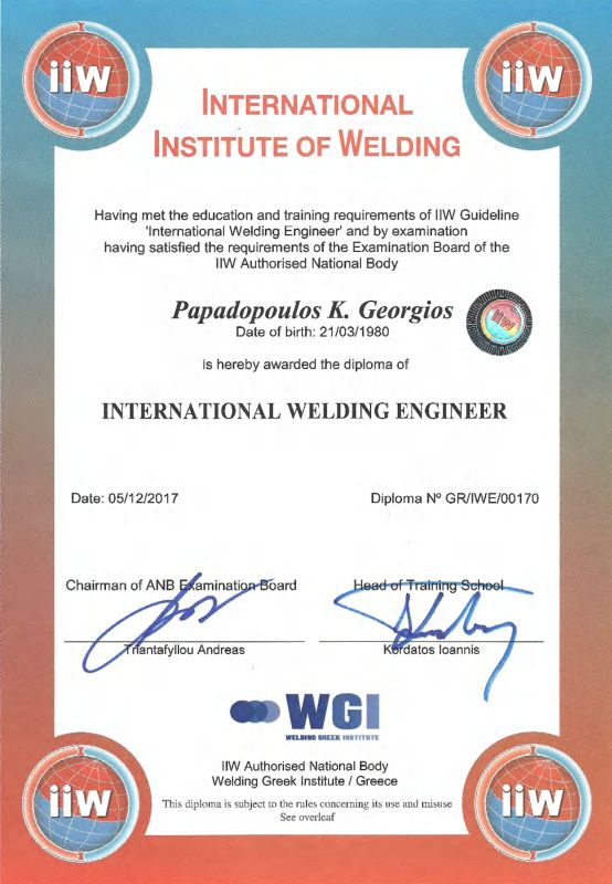 Ειδικότερα επισημαίνεται ότι τη θέση του Μηχανικού Συγκολλήσεων κατέχει ο συνδιαχειριστής της επιχείρησης, Mηχανολόγος Μηχανικός Msc Γιώργος Παπαδόπουλος.